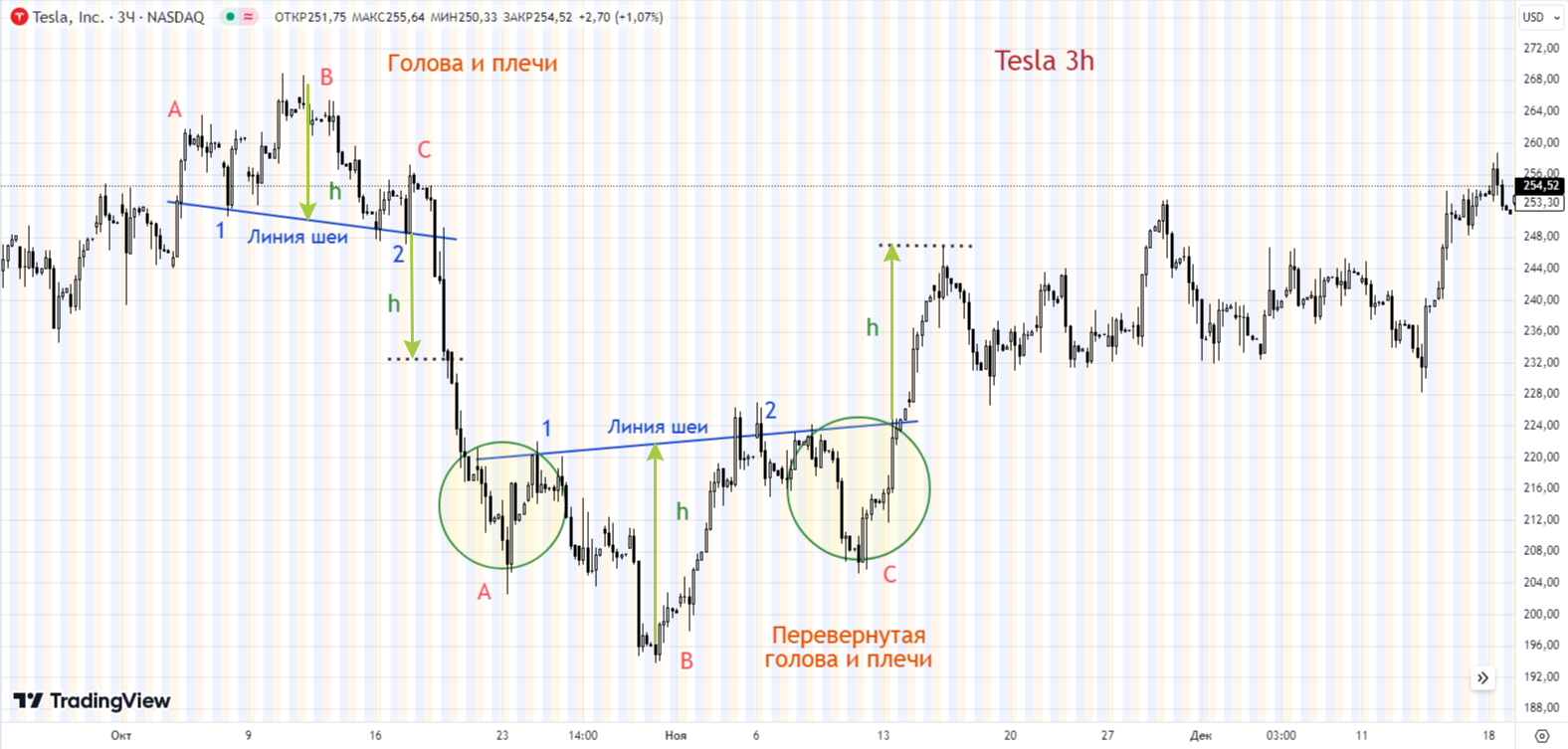 На рис.3 практически последовательно образовались классическая фигура «Голова-плечи», а потом и перевенутая на 3-часовом графике акций компании Tesla. В левой стороне графика видно, что после роста сформировалоась вершина А – первое плечо фигуры. На этот момент мы пока не можем еще предполагать, что будет формироваться фигура H&S. После небольшой коррекции восходящий (Up) тренд возобновился, цена показала новый максимум В, после чего снова скорректировалась вниз, практически до предыдущего минимума. Образовалась голова фигуры, в этот момент опытный трейдер уже может предполагать, что формируется разворотная фигура, но какая, пока не совсем понятно. После новой попытки, цена формирует 3-й максимум С, который оказался ниже предыдущего, причем, цена 2 раза подскакивала вверх - это сдвоенное второе плечо.