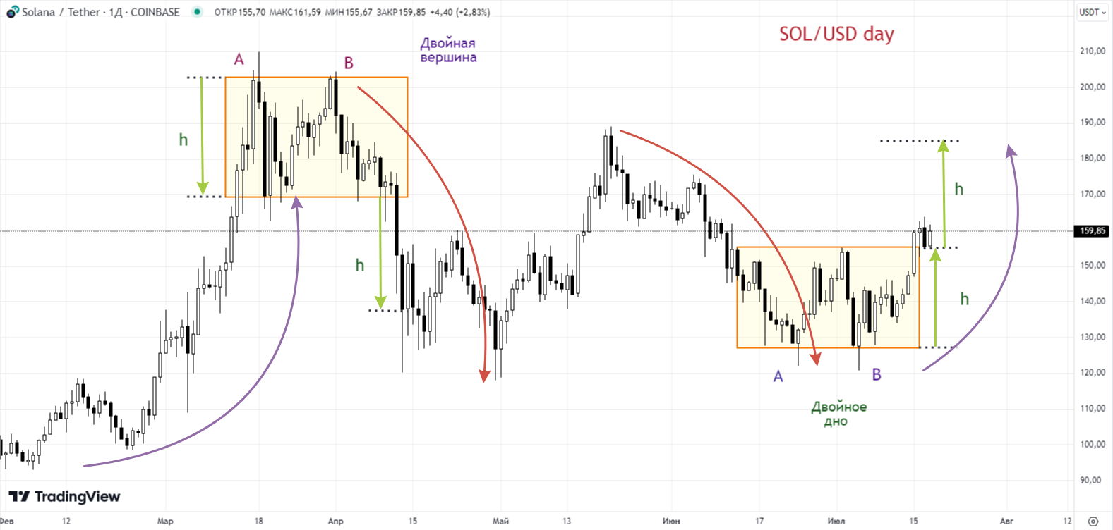 На рис.4 показан дневной график криптовалюты солана Sol/USD, на котором так же последовательно сформировались фигура «двойная вершина» и «двойное дно». Для трейдера формирование такой фигур – настоящая находка. Видим, что цена в течение месяца формировала 2 вершины, первая – довольно остроконечная, а вторая более пологая. После того, как цена пробила нижнюю границу фигуры (она горизонтальная), откладываем вниз высоту фигуры, которую цена отработала буквально за 2 дня. Фигура «двойное дно» еще только сформировалась. Цена пробила ее верхнюю границу, откатила обратно и сейчас начинает рост. Мы отложили вверх высоту фигуры, открыли позицию «на покупку» и теперь ждем, когда цена дойдет до нашей цели. На всякий случай, выставим ордер стоп-лосс ниже границы этой фигуры.