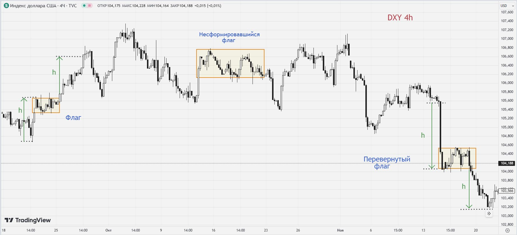 На 4-часовом графике индекса доллара DXY показаны все разновидности флагов: слева - восходящий флаг, у которого явно просматривается вертикальное древко (волна 1). Это отражает резкий рост цены почти на 1.5%, после чего быки взяли передышку и график ушел в боковой диапазон. Это и есть «полотнище», которое в данном случае, практически горизонтальное и состит из четырех волн (2,3,4 и 5). На пятой волне произошел пробой верхней границы этого канала, после чего цена быстро пробила верхнюю границу фигуры и пошла вверх. Именно здесь нужно входить в рынок, в данном случае – покупать, ну а цель равна высоте древка флага h.