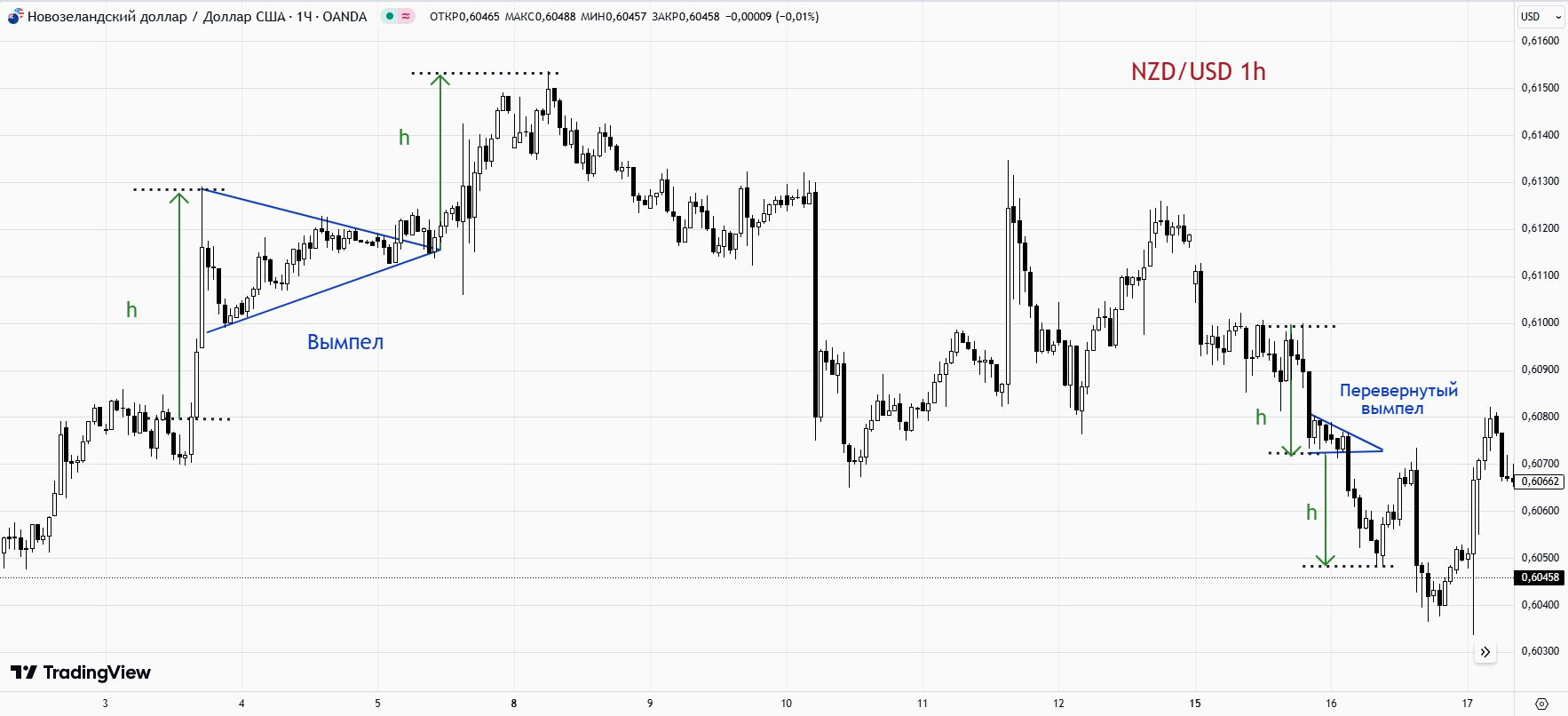 На часовом графике NZD/USD снова видно в левой части сформировался большой бычий вымпел, а в правой части на нисходящем движении – небольшой перевернутый (медвежий) вымпел, у которого нижняя грань – горизонтальная. В обоих случаях после пробоя границы полотнища цена в первом случае почти прошла расстояние h, а во втором случае – полностью отработала себя..